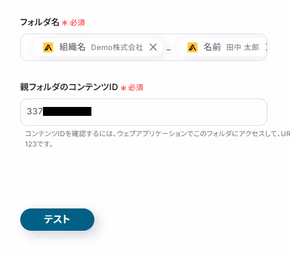 ここでBoxの「フォルダを作成」アクションを追加し、取得したコンテンツIDを「親フォルダのコンテンツID」に設定することで、作成したフォルダ内にサブフォルダが作成できます。