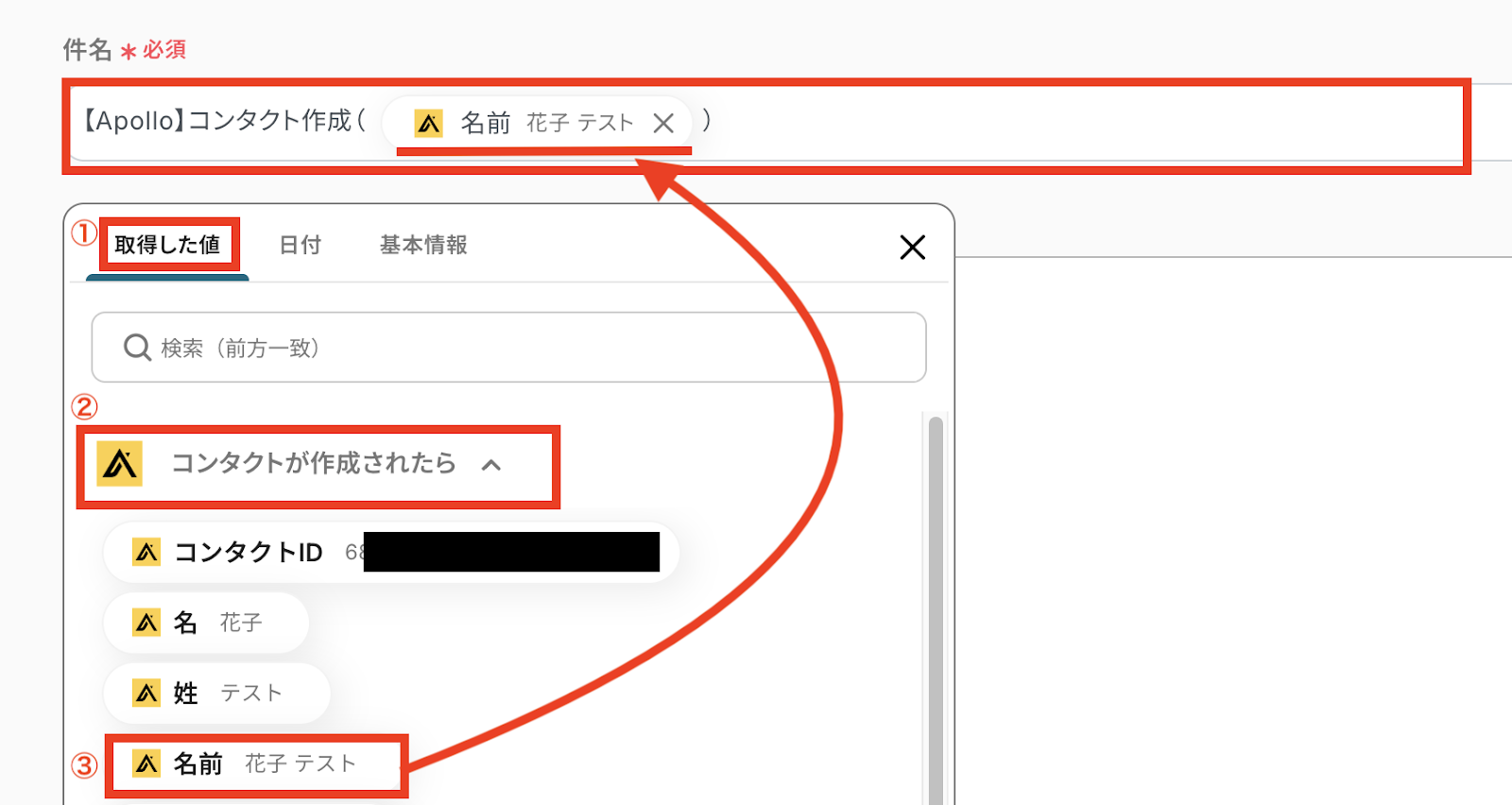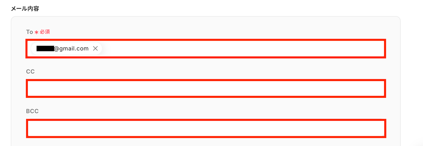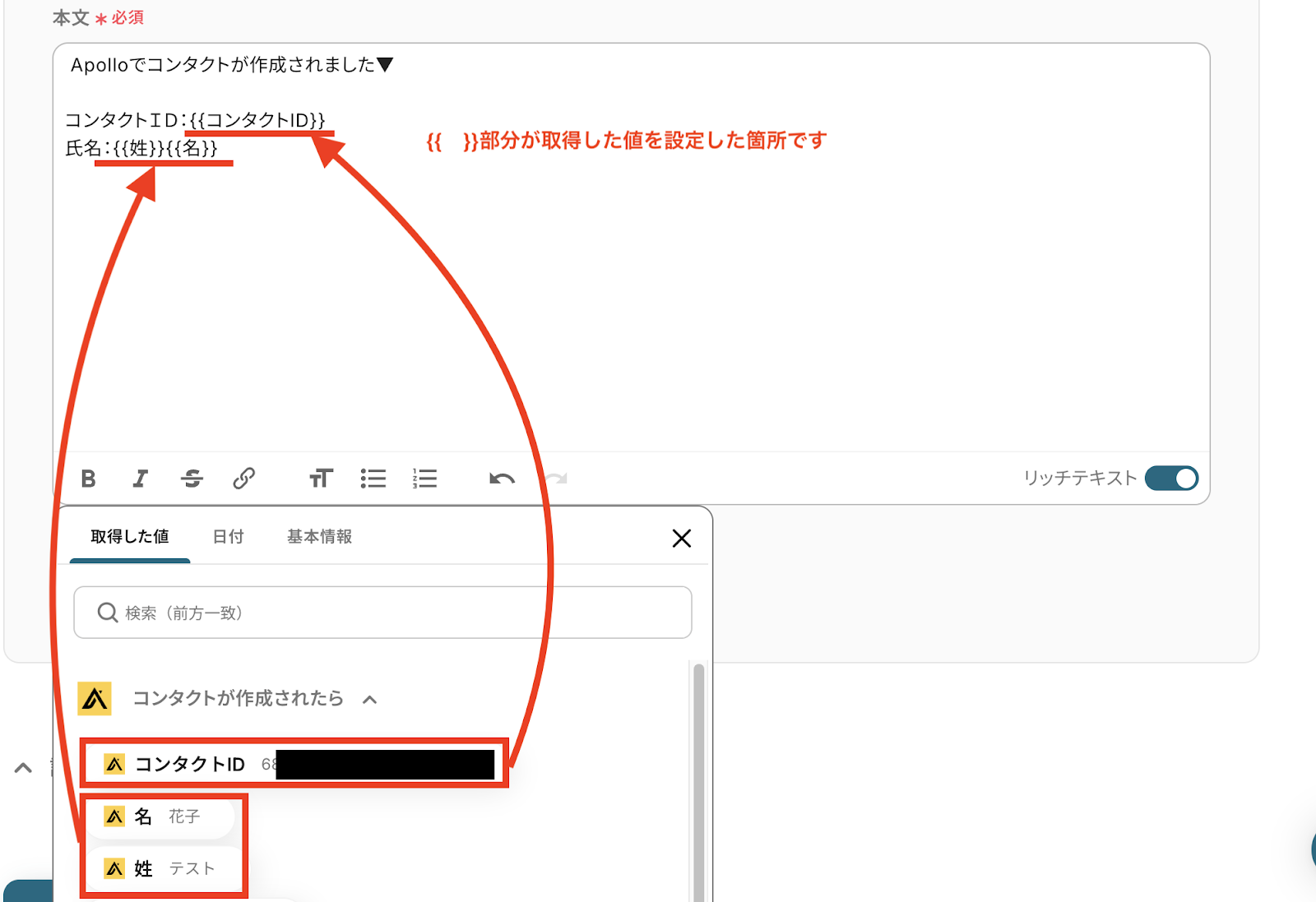 「件名」と「本文」は文字を手入力するだけでなく、ステップ3で取得した値を活用することができます。