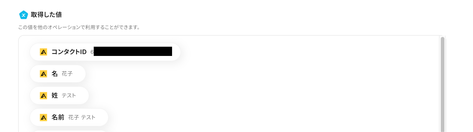 テストに成功すると「取得した値」の欄にコンタクトに関するデータがアウトプットされるので、確認できたら「保存する」をクリックしましょう!