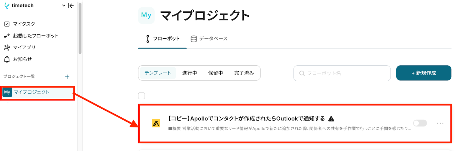 左側にあるメニューの「マイプロジェクト」から、コピーしたテンプレートを開きます。