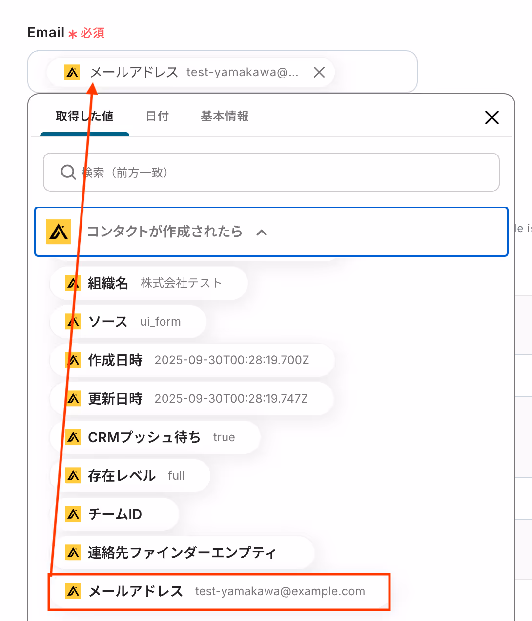 こちらもEmailと同様に、入力欄をクリックすると取得した値が表示されるので選択して入力できます。