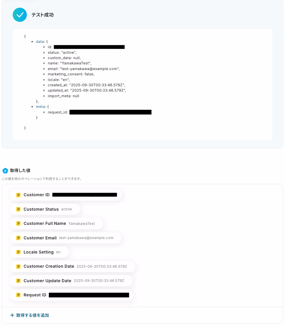 その他の項目も任意で入力が完了したら「テスト」をクリックし、設定した内容でカスタマーが作成されるか確認しましょう。