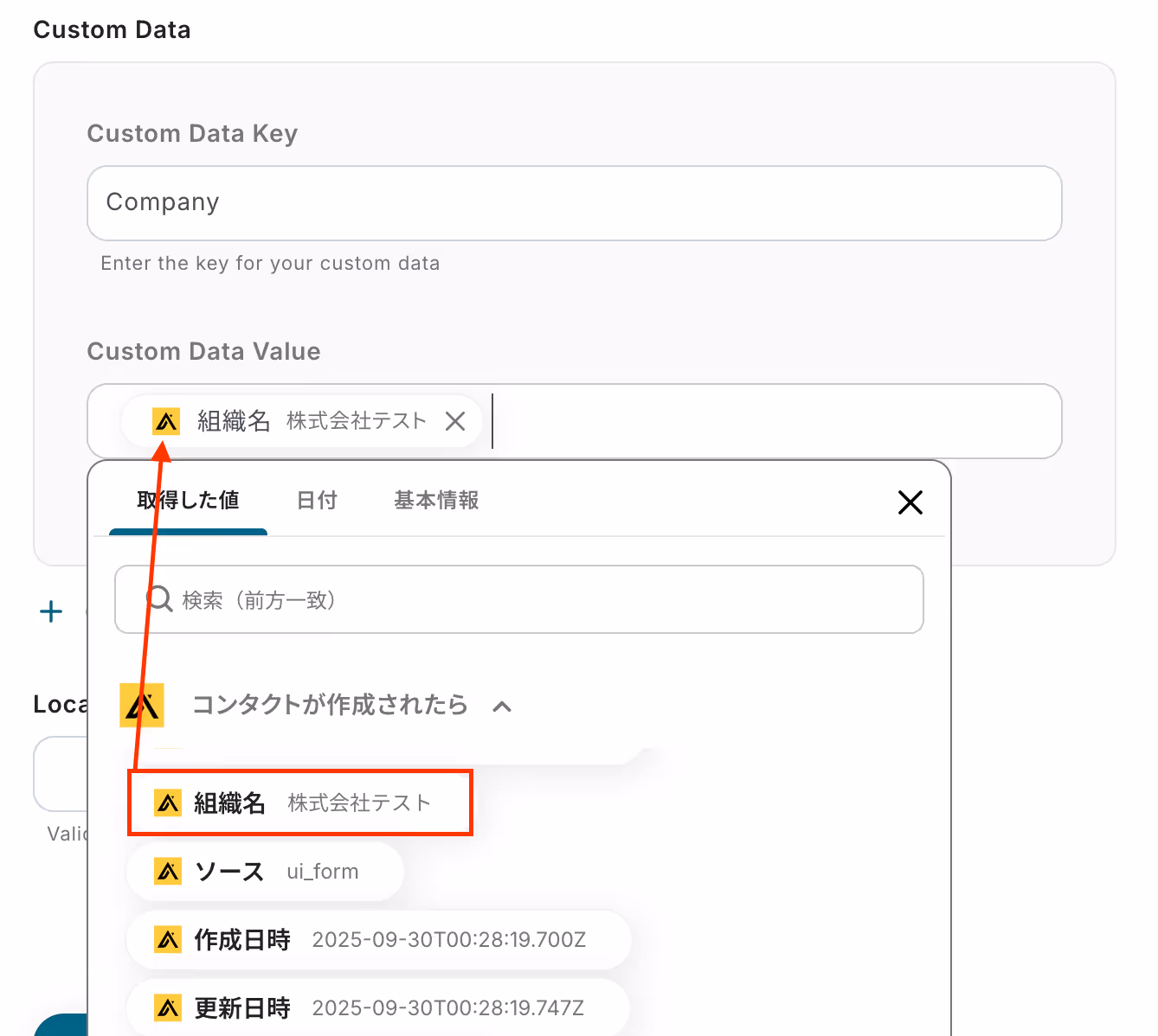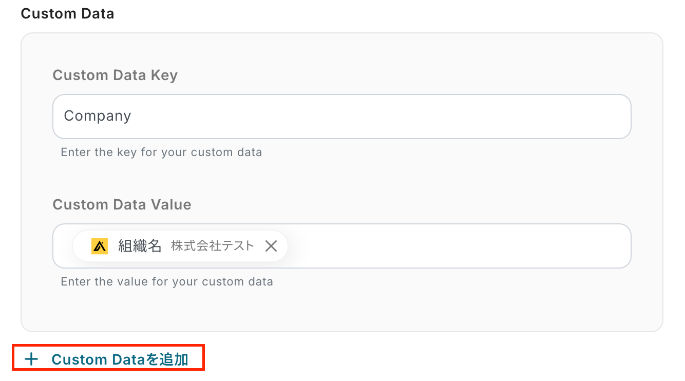 たとえば、以下の画像のようにCustom Data Keyにcompanyを設定し、Custom Data ValueにApolloから取得した組織名を入力することで、顧客レコードにカスタム情報を付与できます。