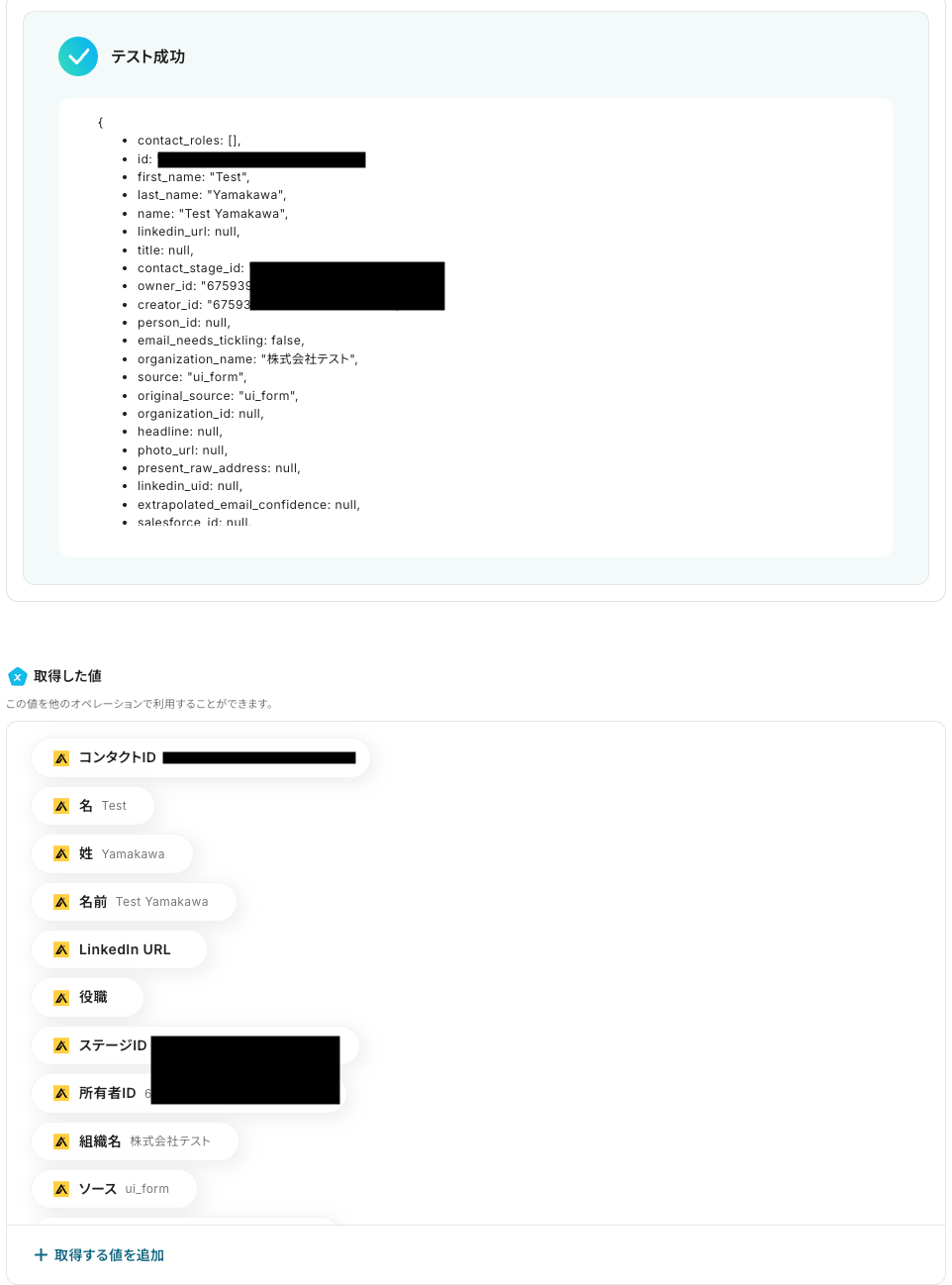 この連携により、コンタクト作成から顧客登録までの一連の流れが自動化されるため、作業時間を削減し、入力ミスを防いでデータの正確性を担保 できます。