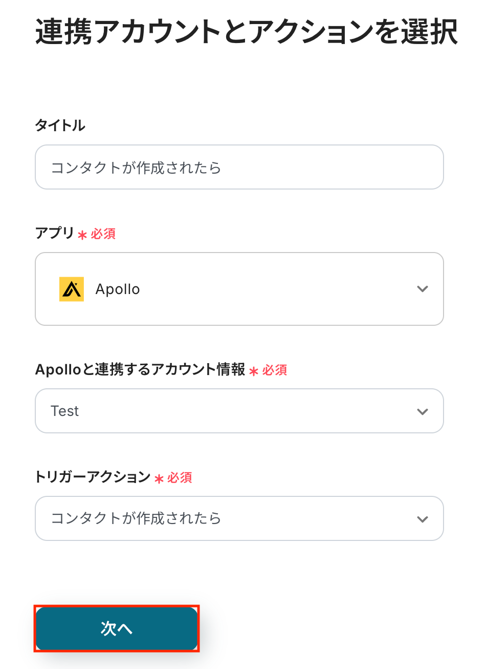 Apolloと連携するアカウント情報に問題がなければ、「次へ」をクリックします。