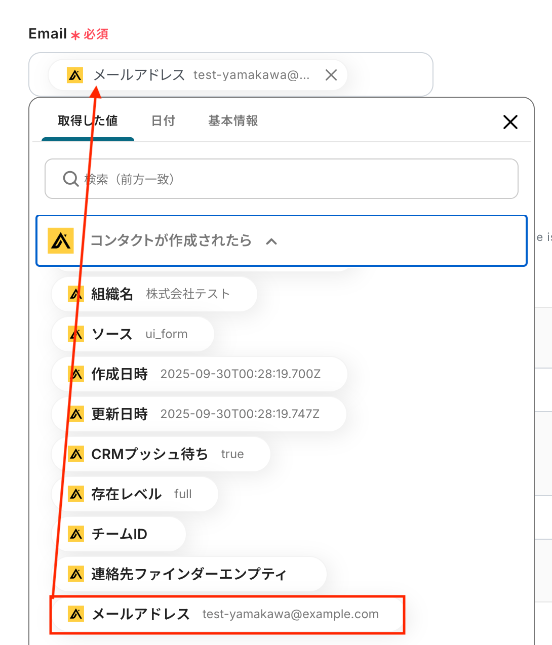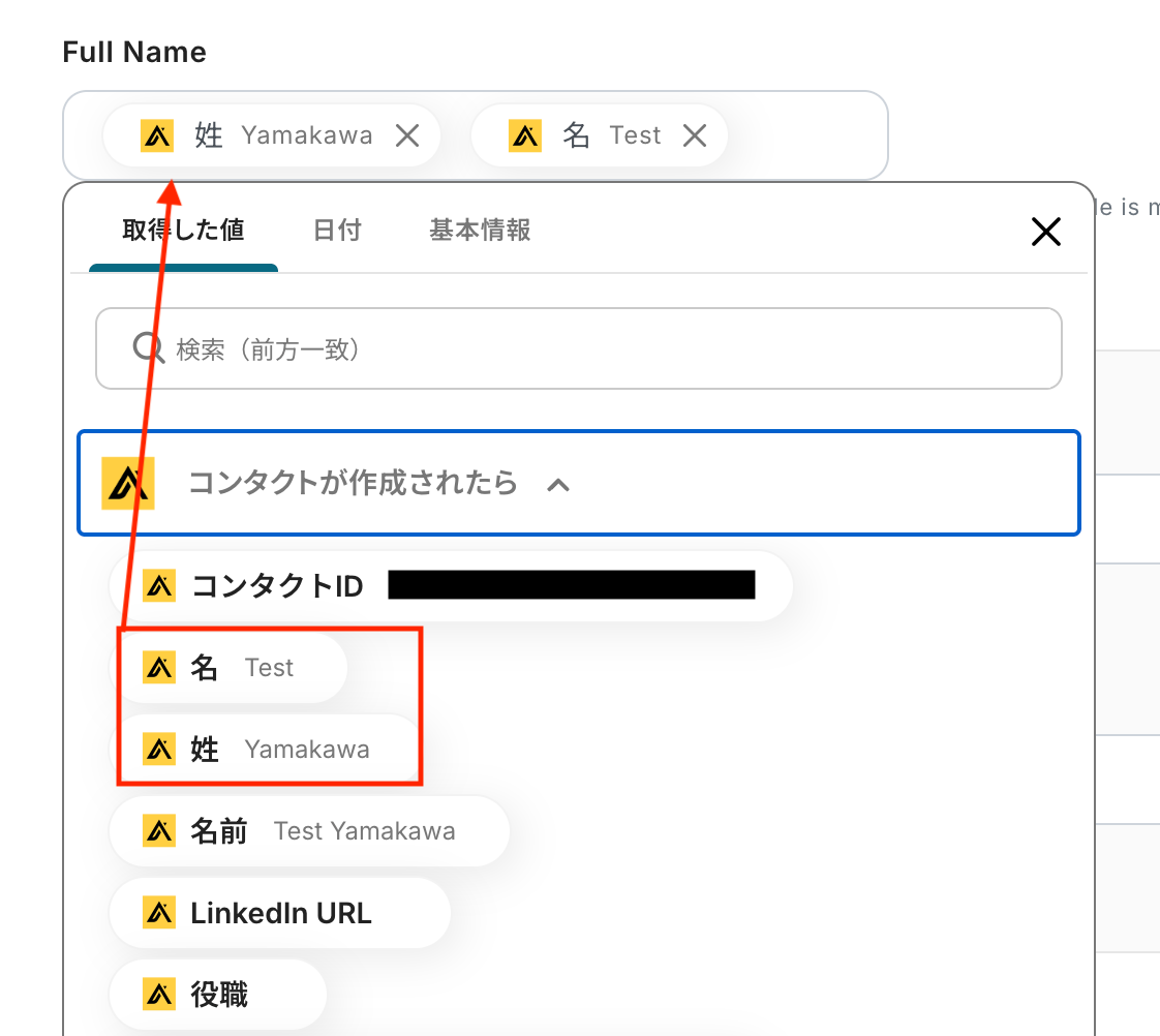 Full Name こちらもEmailと同様に、入力欄をクリックすると取得した値が表示されるので選択して入力できます。