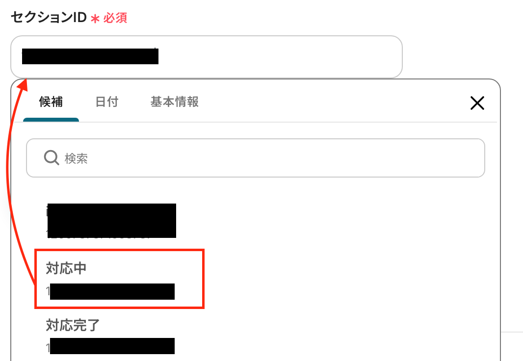 「セクションID」も同様に、入力欄をクリックして表示される候補から該当するものを選択します。