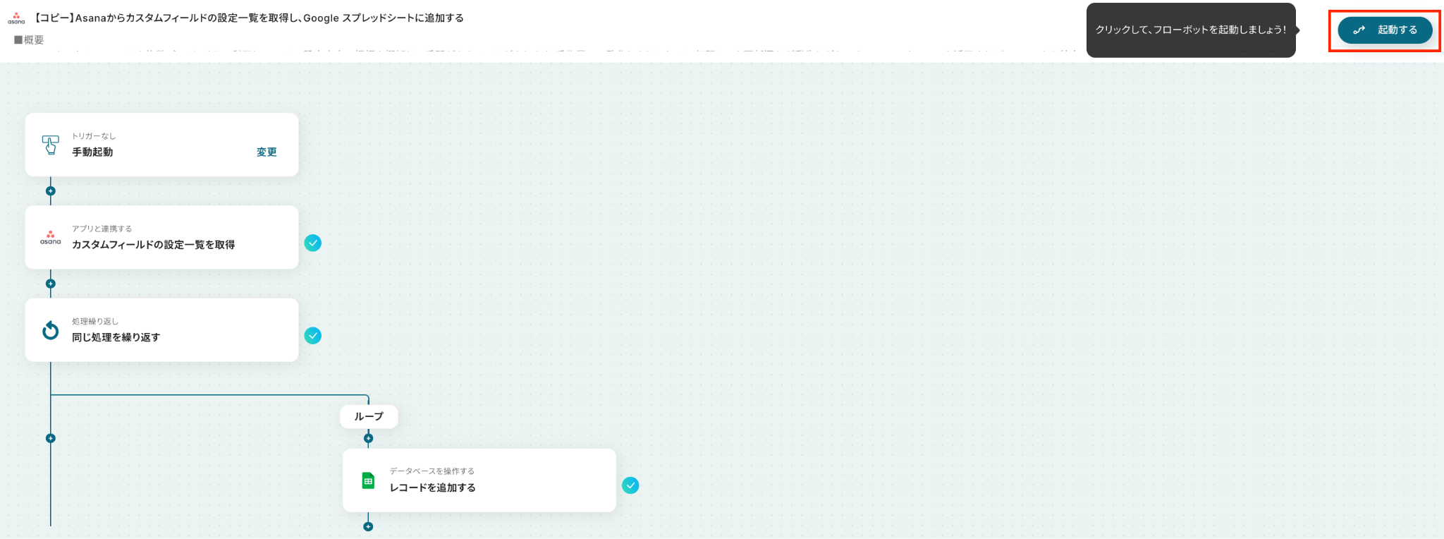 すべての設定を完了させると、フローボットの画面右上に「起動する」ボタンが表示されます。 フローを起動したい際に、フローボットを手動で起動させてください。