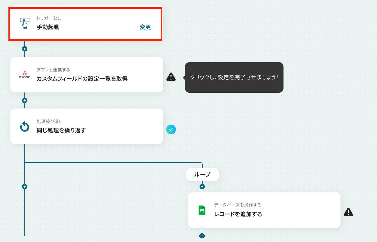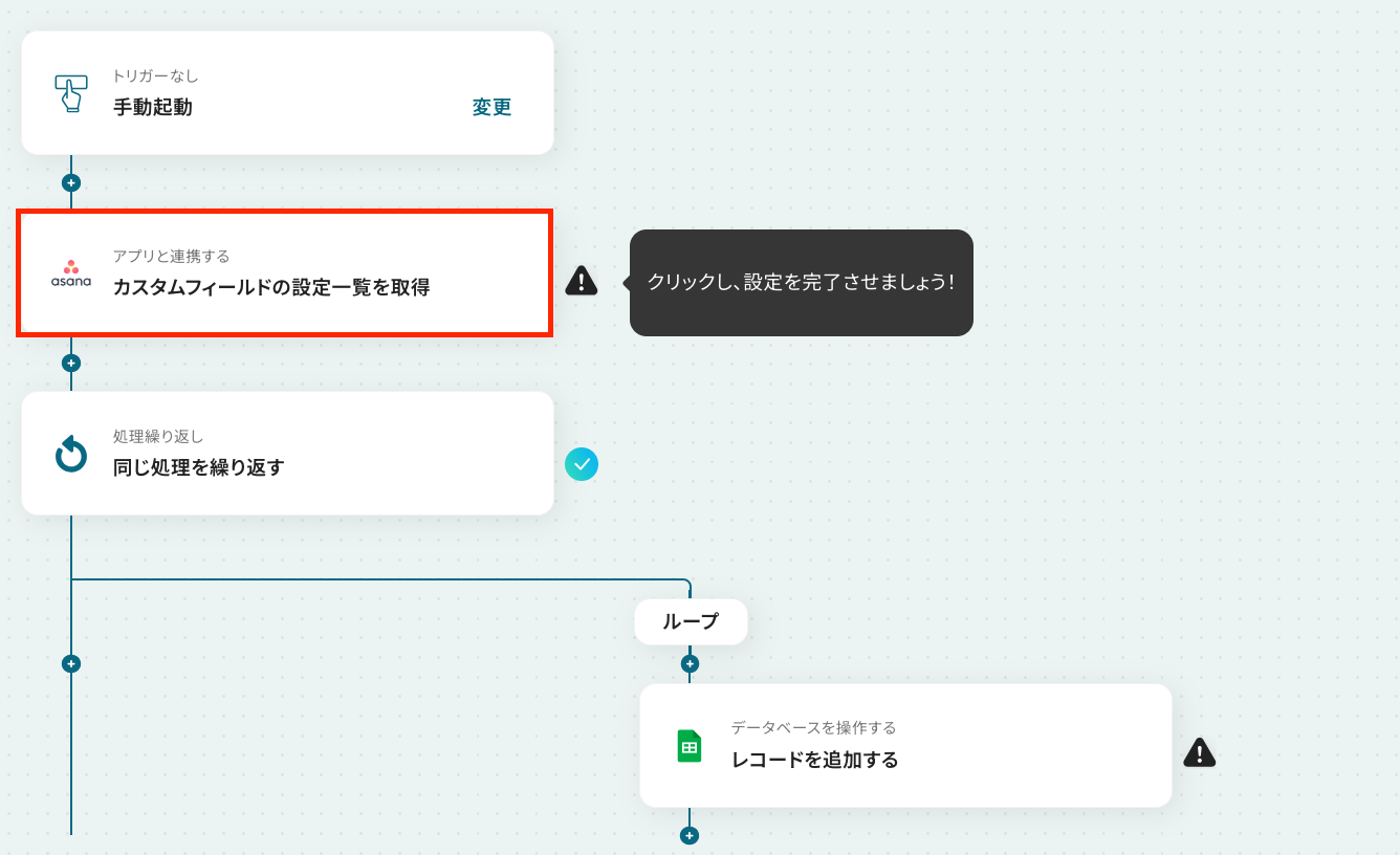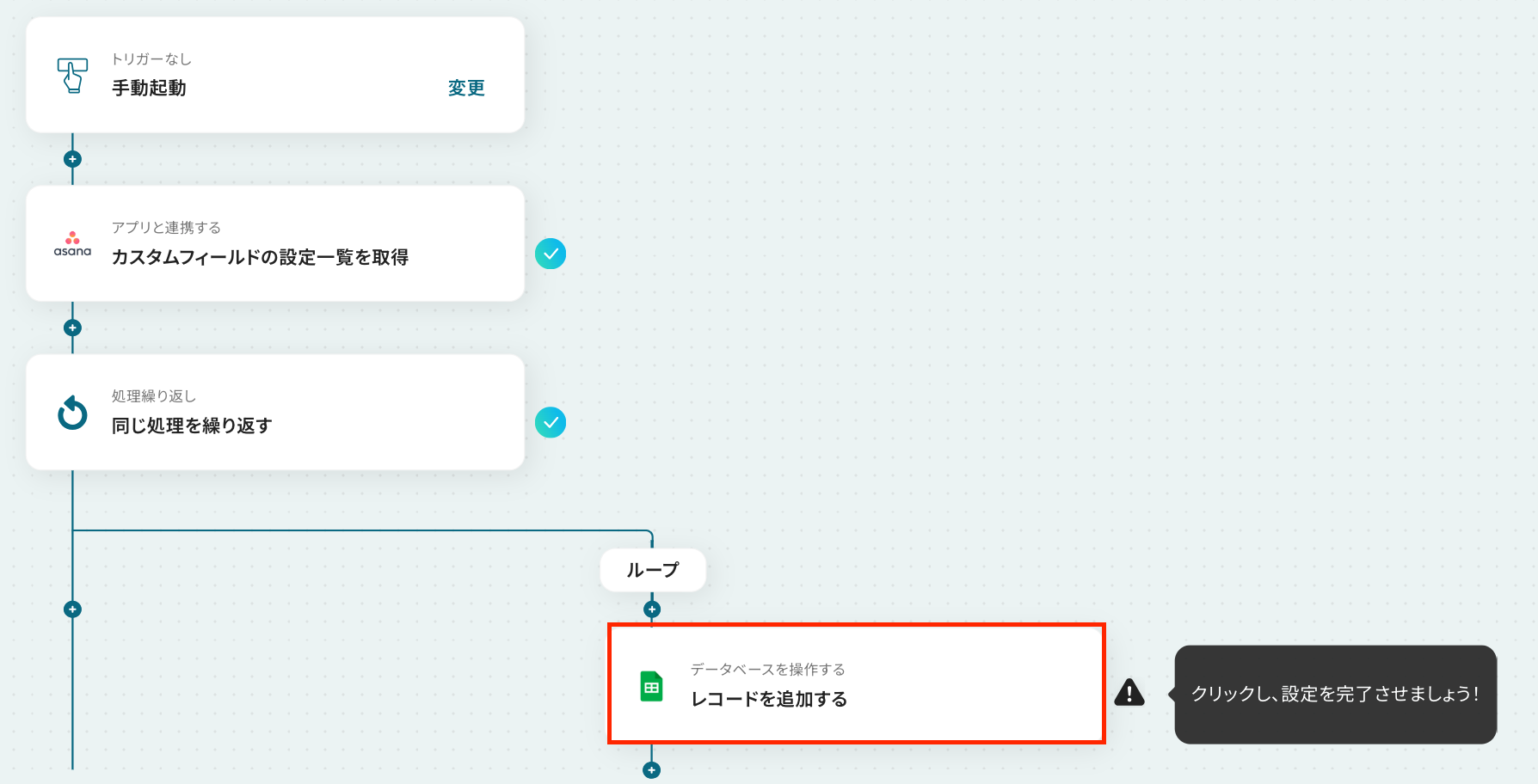 ステップ6:Google スプレッドシートにレコードを追加する設定 最後の設定です! Asanaのカスタムフィールドの設定一覧をGoogle スプレッドシートに追加する設定を行います。 それでは、以下の赤枠をクリックしましょう!