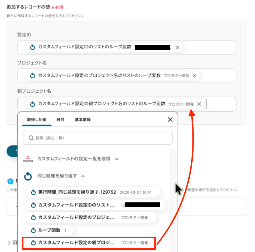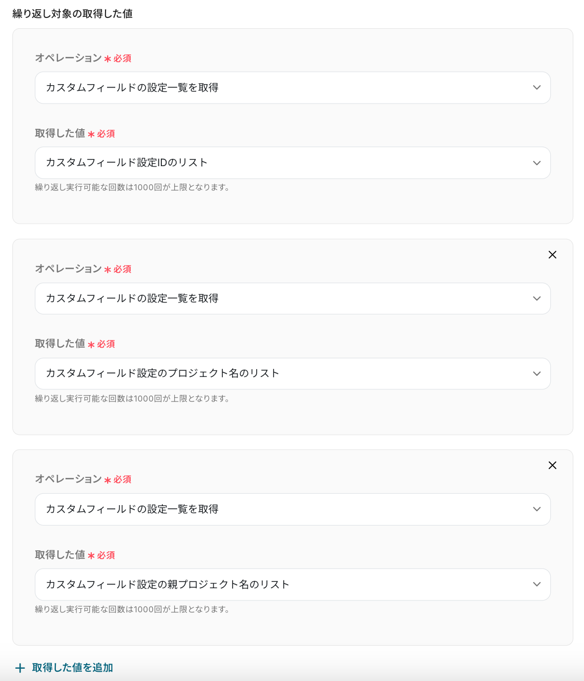 次の画面で、「繰り返し対象の取得した値」を設定します。 「オペレーション」は、「カスタムフィールドの設定一覧を取得」 を選択してください。 「取得した値」は、先ほどのステップで取得した「カスタムフィールド設定IDのリスト」・「カスタムフィールド設定のプロジェクト名のリスト」・「カスタムフィールド設定の親プロジェクト名のリスト」 を設定しましょう!