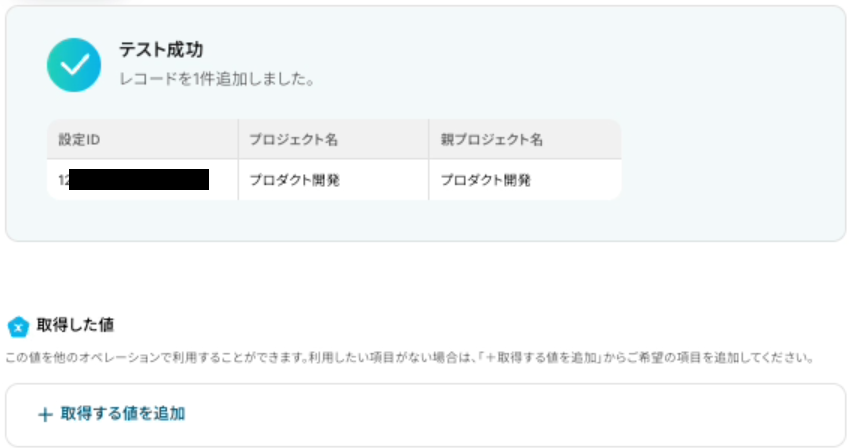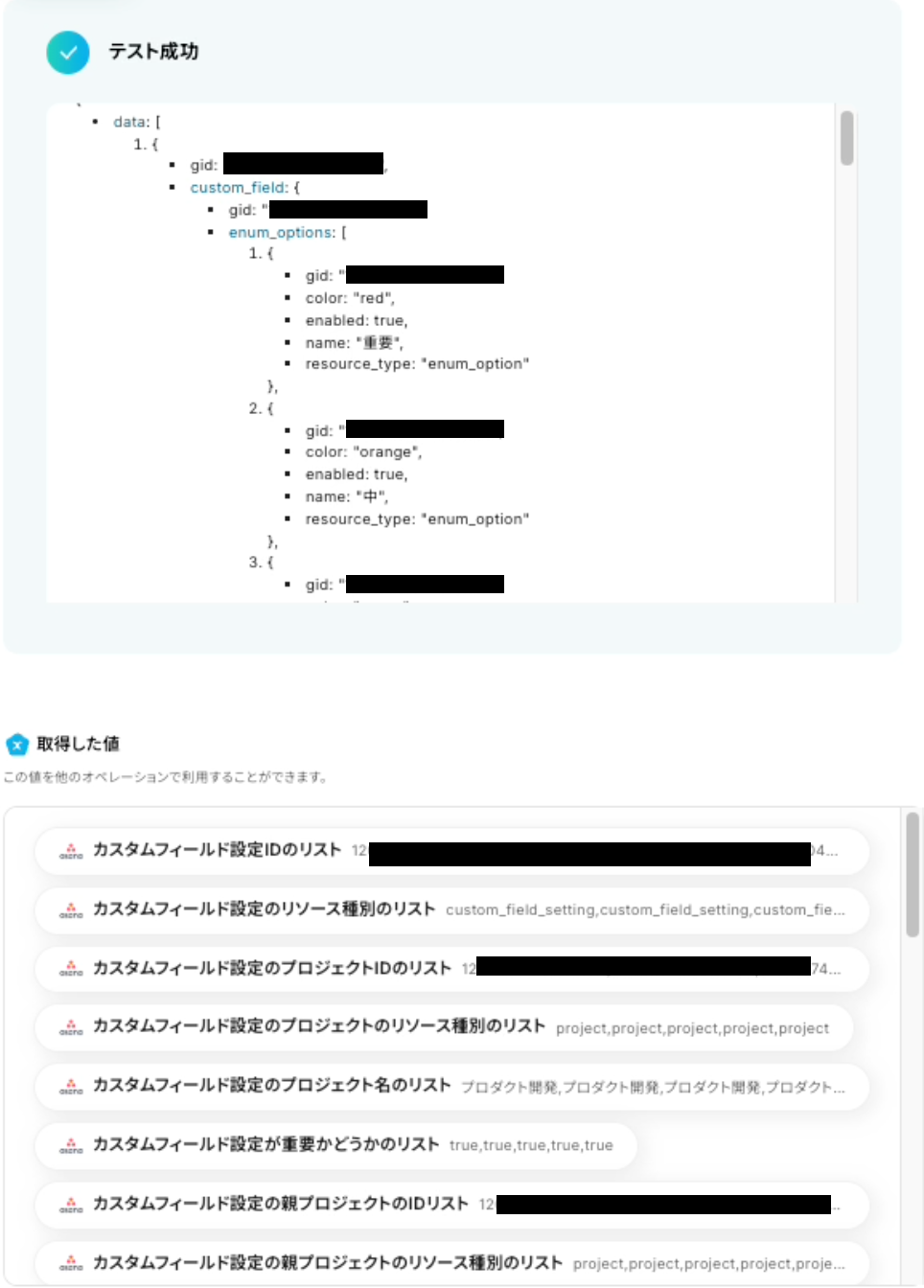 入力が完了したら、「テスト」をクリックしましょう! テストが成功すると、取得した値としてカスタムフィールドの設定一覧を取得できます。