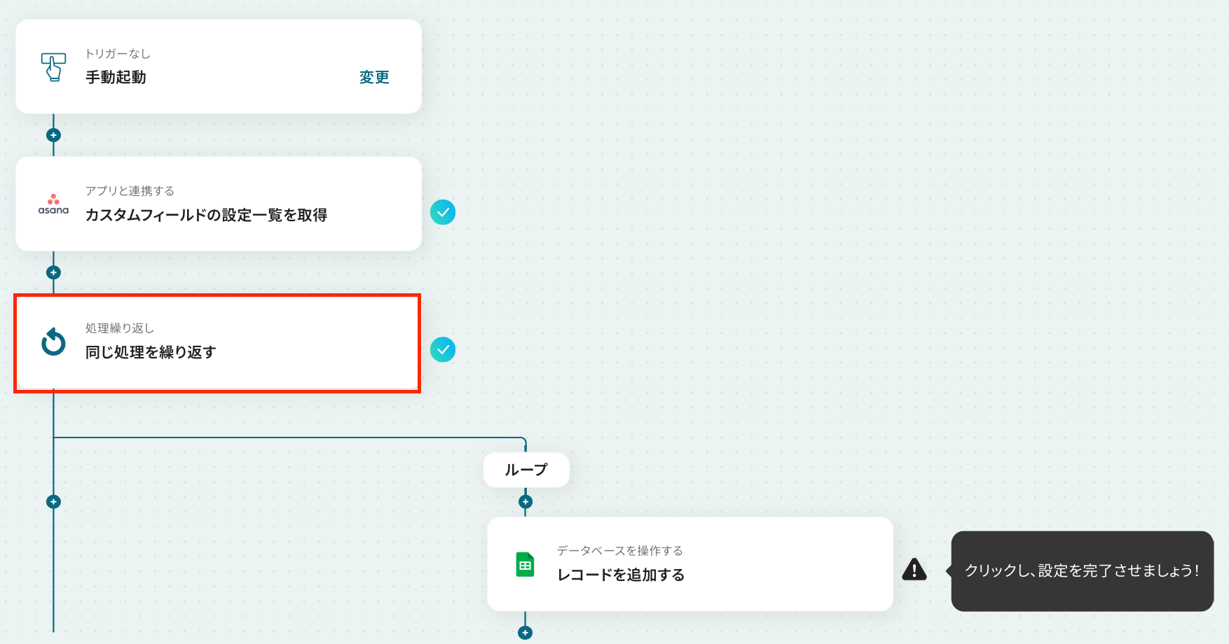 ステップ5:繰り返し処理の設定 ここでは、繰り返し処理の設定を行います。 同じ処理を繰り返すオペレーション(ループ処理)を用いることで、取得した値を繰り返し後続のオペレーションに進めることが出来ます。 以下の注意事項を確認後、赤枠をクリックしてください。 ※「同じ処理を繰り返す」オペレーション間の操作は、チームプラン・サクセスプランでのみご利用いただける機能となっております。フリープラン・ミニプランの場合は設定しているフローボットのオペレーションやデータコネクトはエラーとなりますので、ご注意ください。
