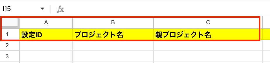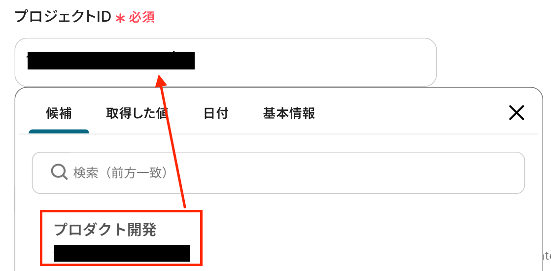 まずは「プロジェクトID」 を設定します。 入力欄をクリックすると、「候補」が表示されるので選択してください。