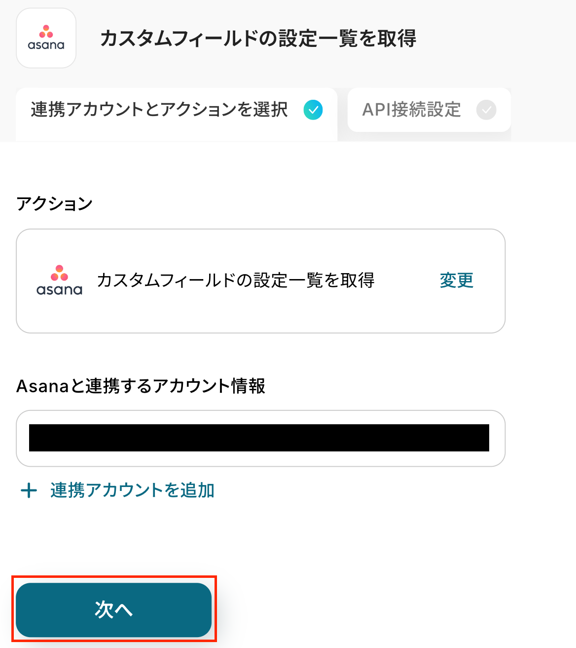 ステップ4:Asanaのアクション設定 ここでは、Asanaの指定したプロジェクトのカスタムフィールド設定一覧を取得する設定を行います。 以下の赤枠をクリックしましょう!