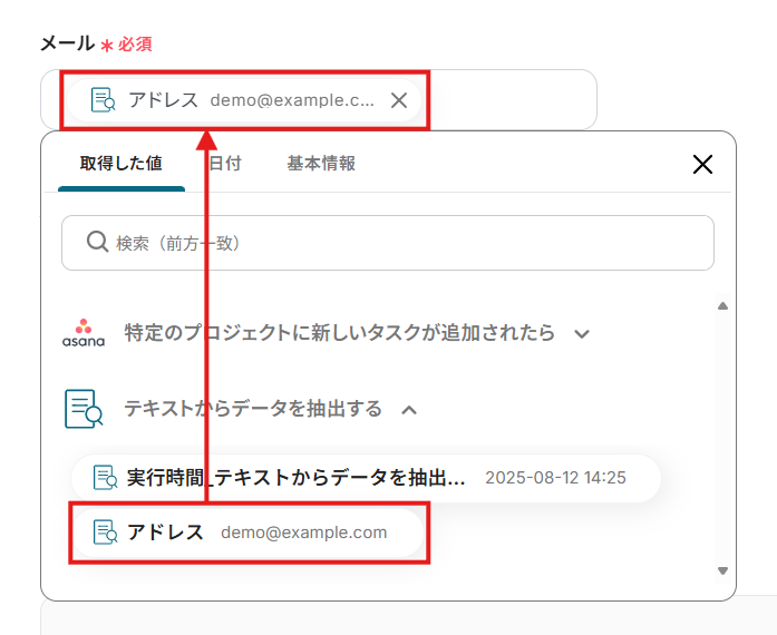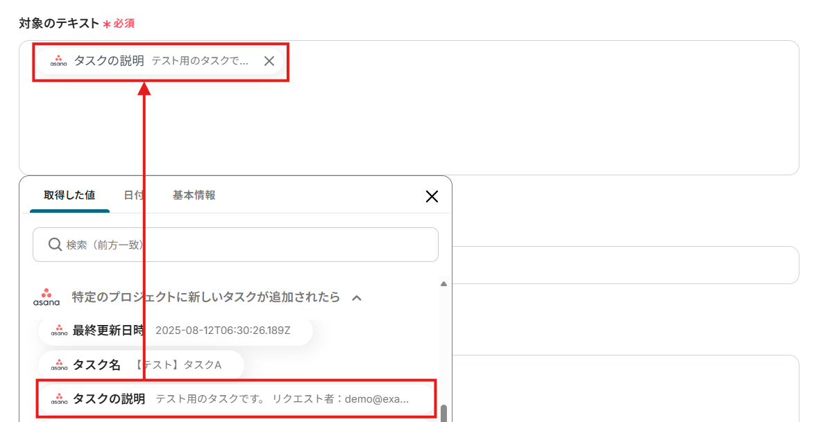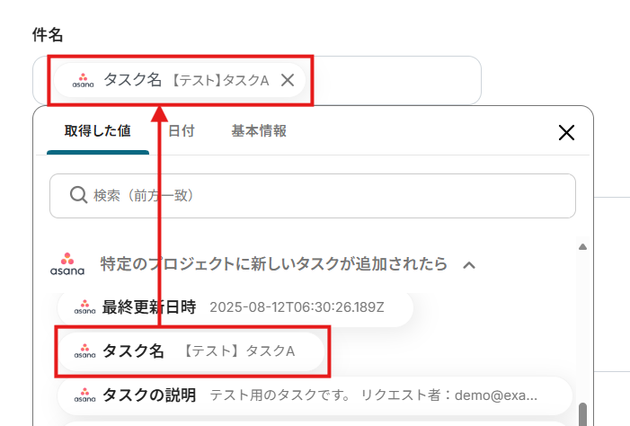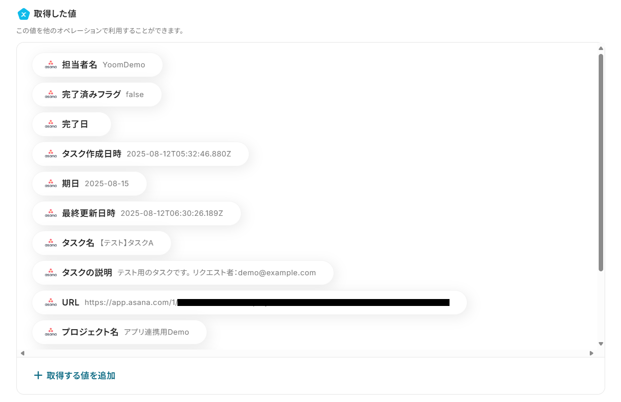 - テストに成功すると、「取得した値」に最も新しいタスクの情報が追加されます。
