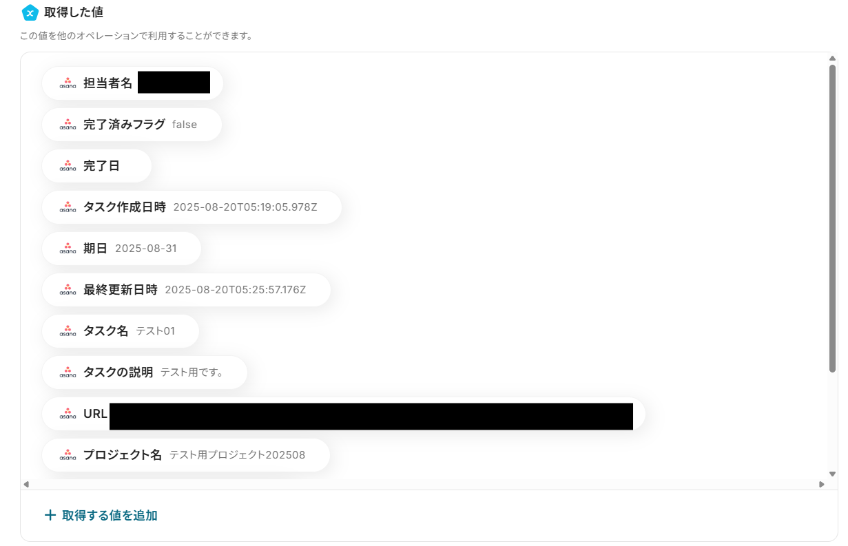 テストに成功すると「取得した値」(アウトプット)に反映されます。