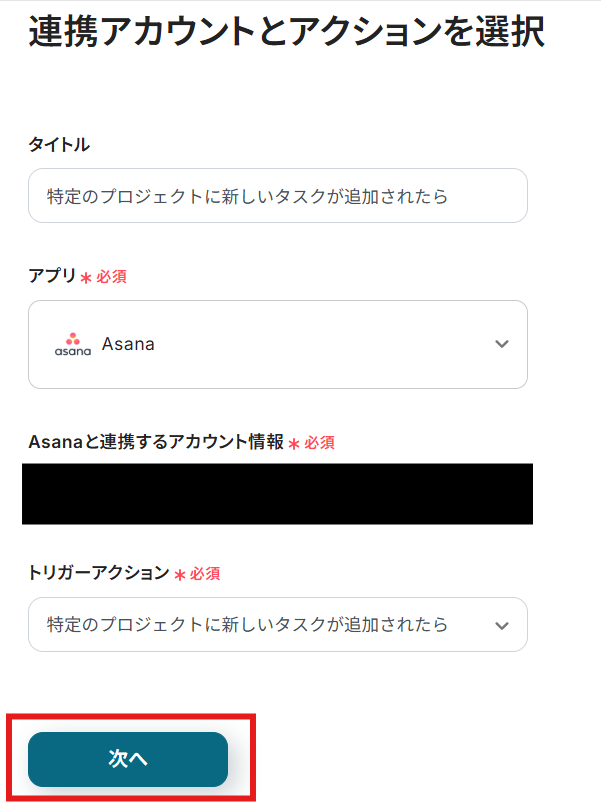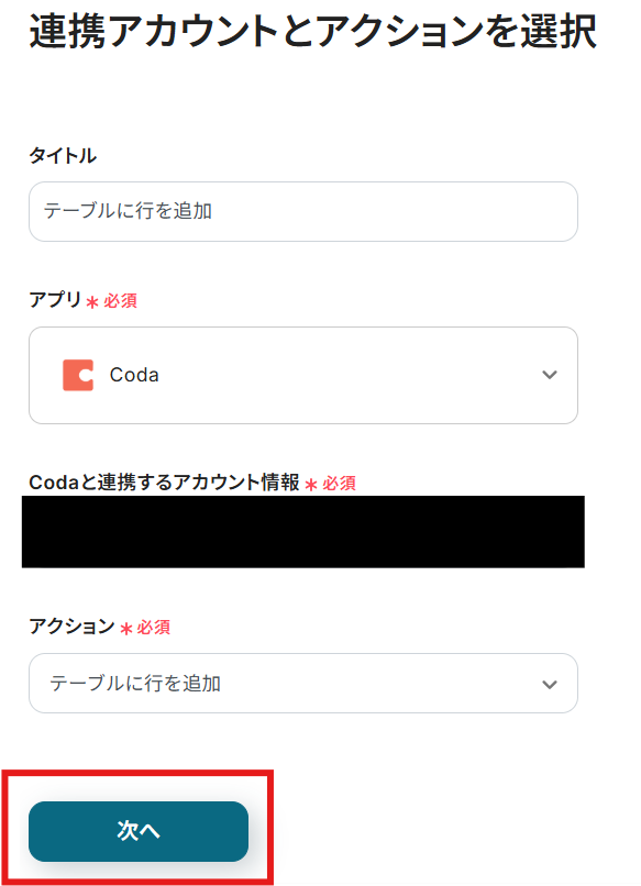タイトルと連携するアカウント情報を確認し、アクションはテンプレート通りのまま「次へ」をクリックして進んでください。