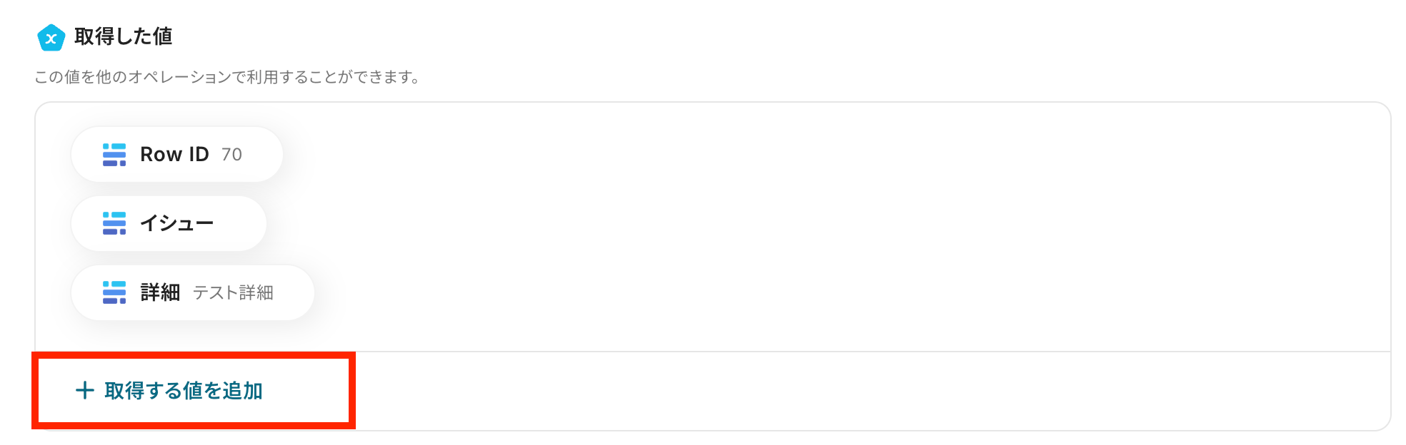 ※取得した値とは、トリガーやオペレーションにて受け取ったデータのことです。 取得したアウトプットは、後続のオペレーション設定時の値としてご利用いただくことができ、フローボットを起動する度に、変動した値となります。