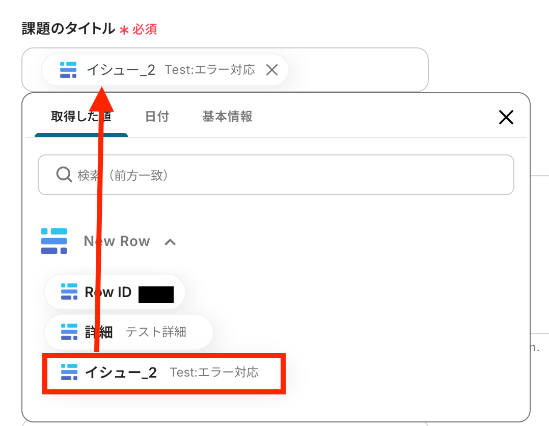 先ほど取得した値の中から課題のタイトルを設定しましょう。 Baserowのアイコンから課題のタイトルにしたい値をクリックします。 取得した値を利用することで、フローボットが起動するたびにBaserowで追加された行情報をGitLabに反映できます。 定型文を追加する場合は、直接入力してください。