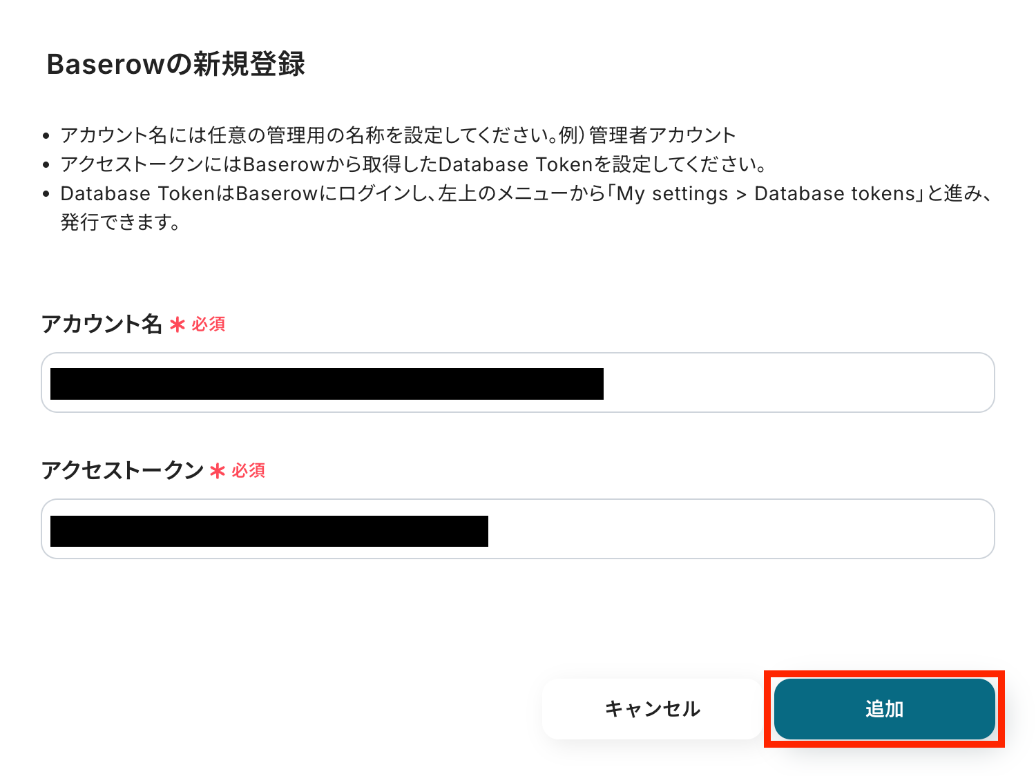 任意で管理用のアカウント名を記入し、アクセストークンをBaserow上で確認して記入したら「追加」ボタンを押します。