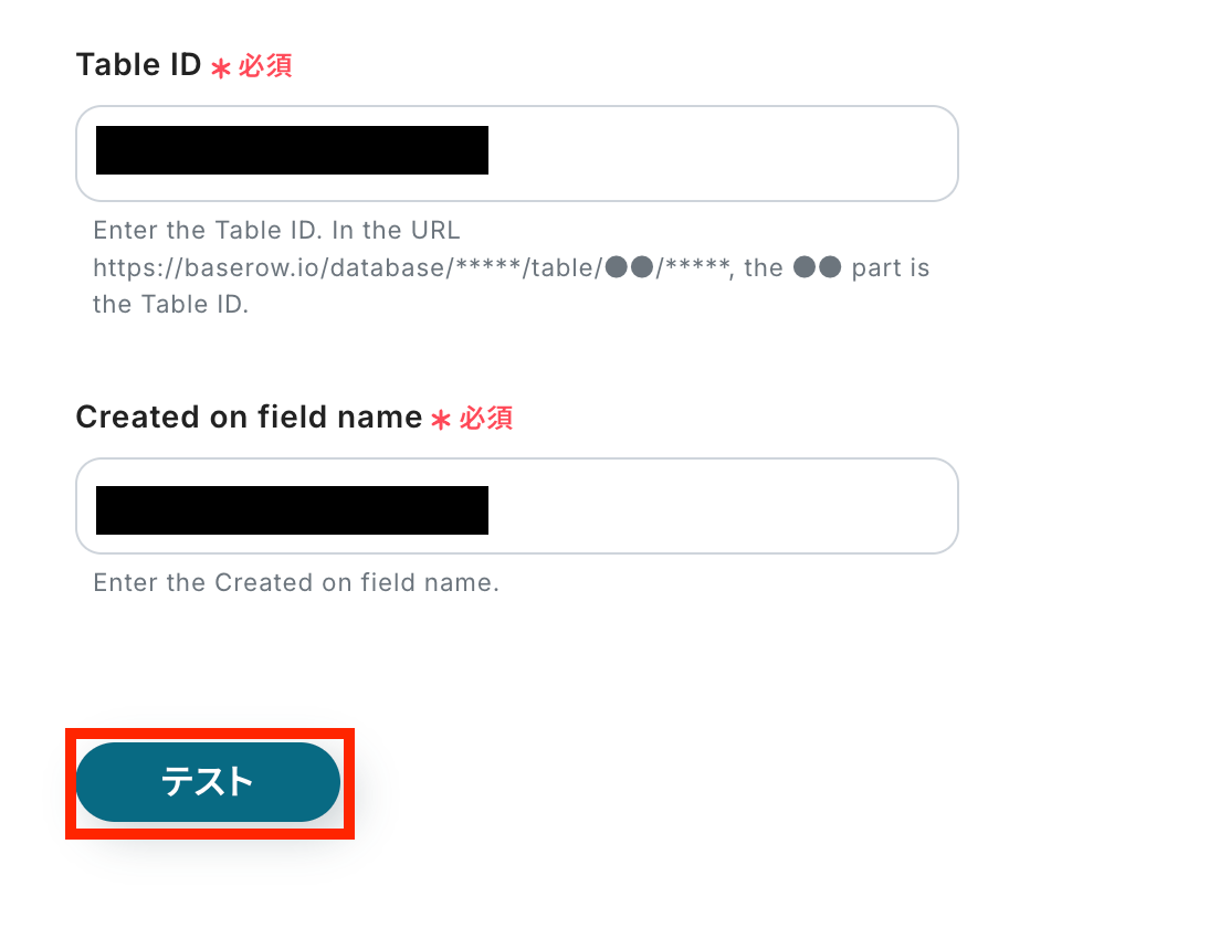 Yoomの設定画面に戻ります! 行を追加したテーブルのTable IDと作成日のフィールド名をBaserowより確認して記載します。 設定が済んだら「テスト」をクリックしましょう!
