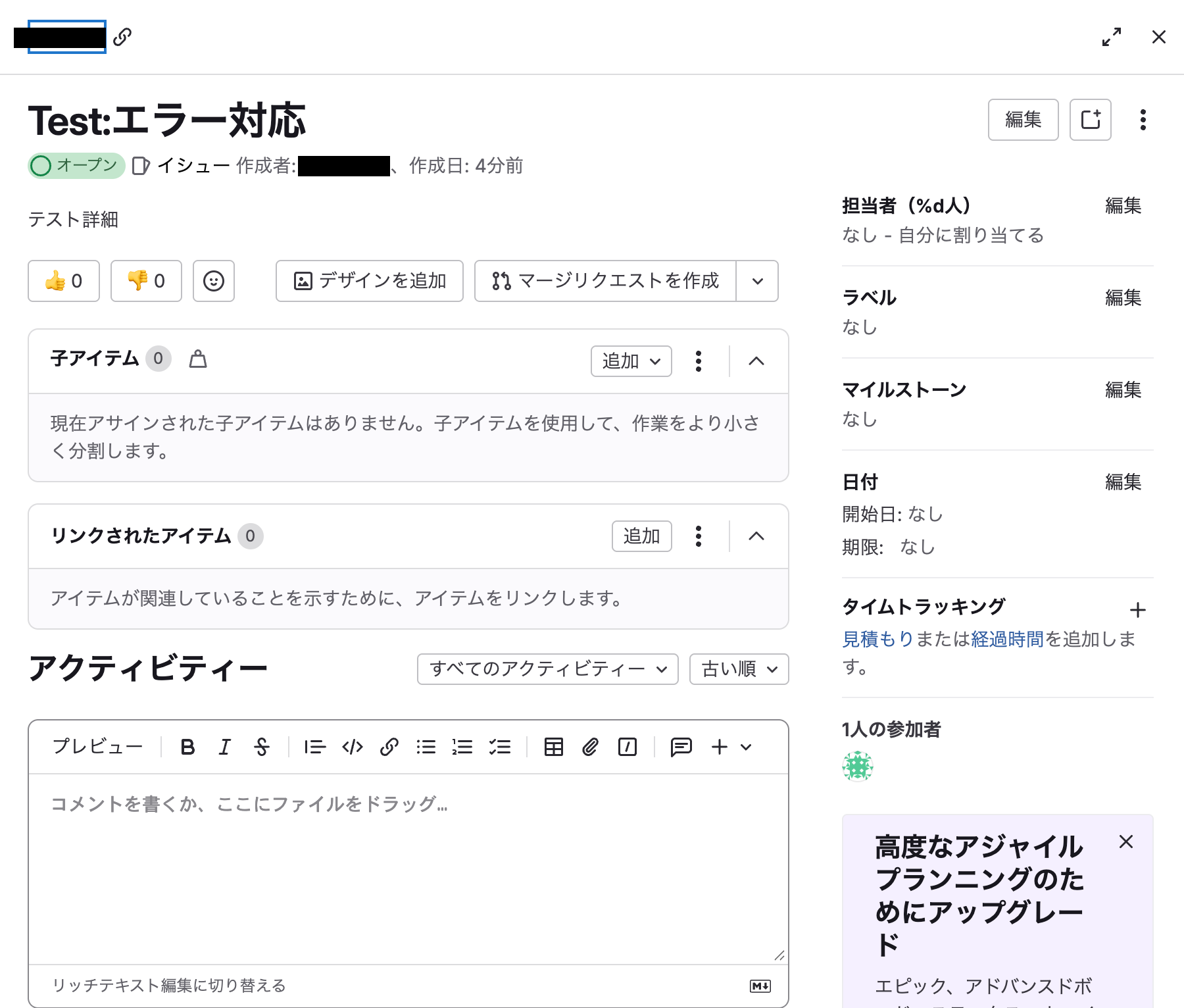テスト成功という表示がされたら、GitLabにてイシューが作成されています。 確認してみましょう!