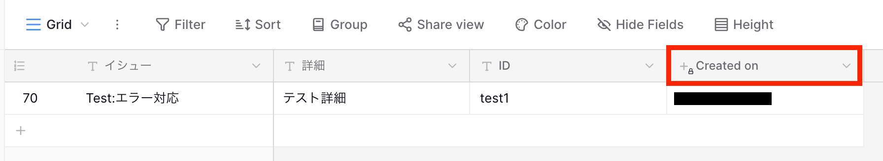 Baserowのテーブルにテストのための新しい行を追加します。 ※後ほどYoomで設定が必要になるため、新しい行の作成の際に、「Created on(作成日)」のフィールドの追加を忘れずに行いましょう!