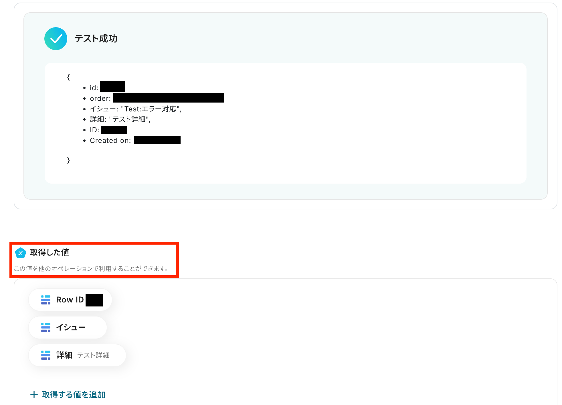 テスト成功で、取得した値 にBaserowの情報が表示されます。
