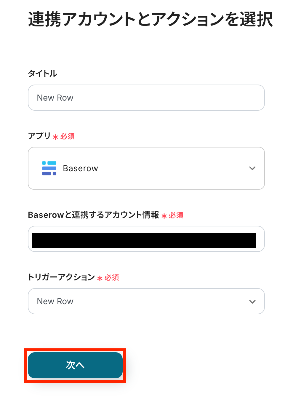 連携するアカウント情報に間違いがないかを確認しましょう。 トリガーアクションは、「New Row」のままで問題ありません。 「次へ」ボタンをクリックします。