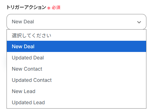 - トリガーアクション:プルダウンより設定可能です。今回はデフォルトで設定されている項目(New Deal)のまま進みます。