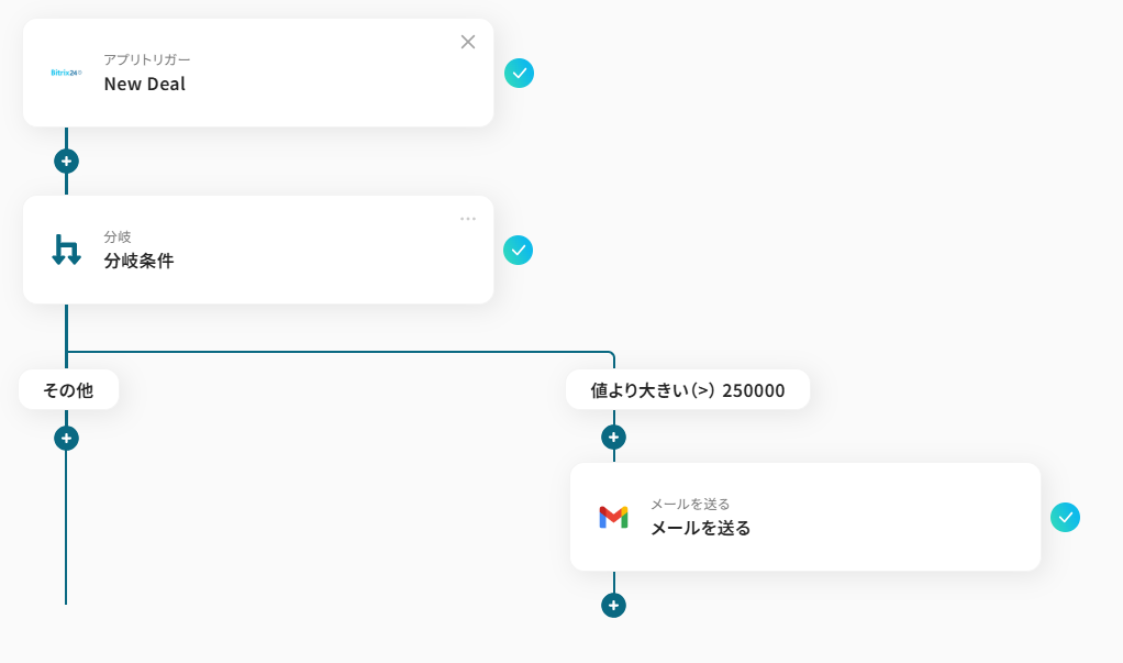 例えば以下の画像のように「金額が250,000よりも大きい場合にのみメールを送信する」といったフローも作成が可能です。