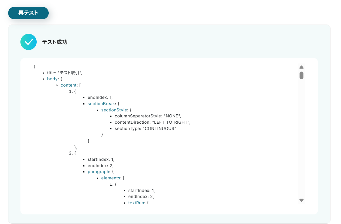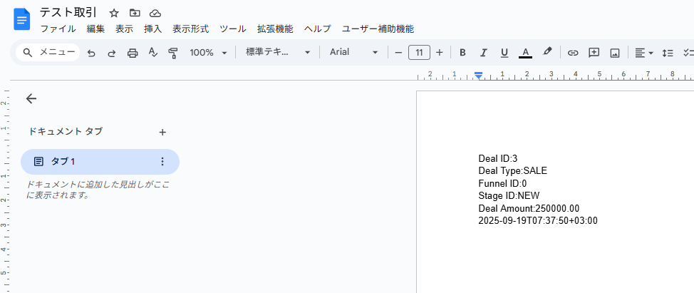 Googleドキュメントを参照すると、設定した文章が追加されていることが確認できます。