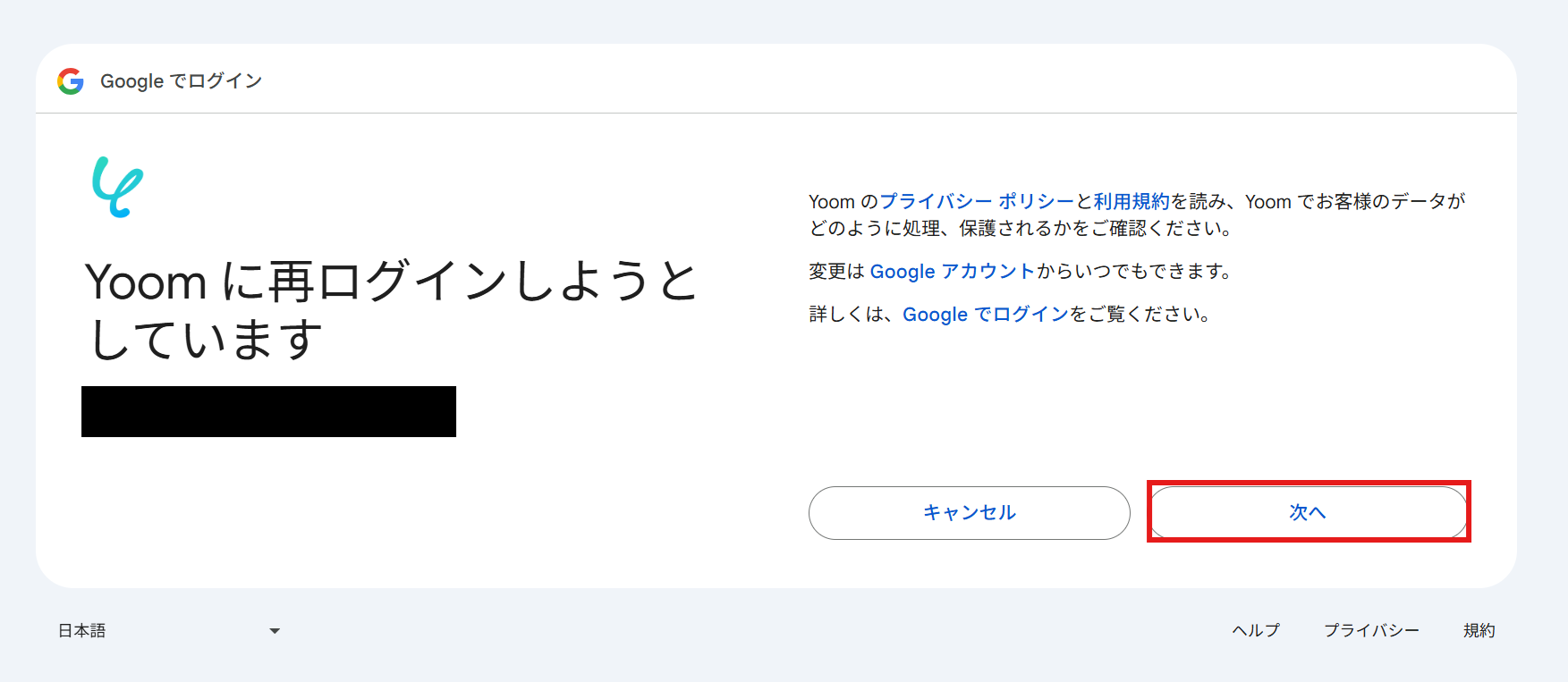 選択したGoogleアカウントで、ログインの確認画面が表示されるので、「次へ」をクリックします。