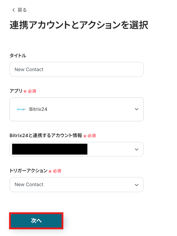 - Bitrix24と連携するアカウント情報:フローと紐づけるアカウントを選択してください。