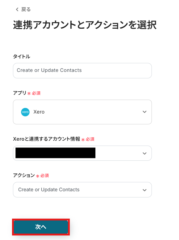 連携アカウントとアクションを選択画面では、下記画像を参考に設定を行い次へボタンをクリックしましょう。