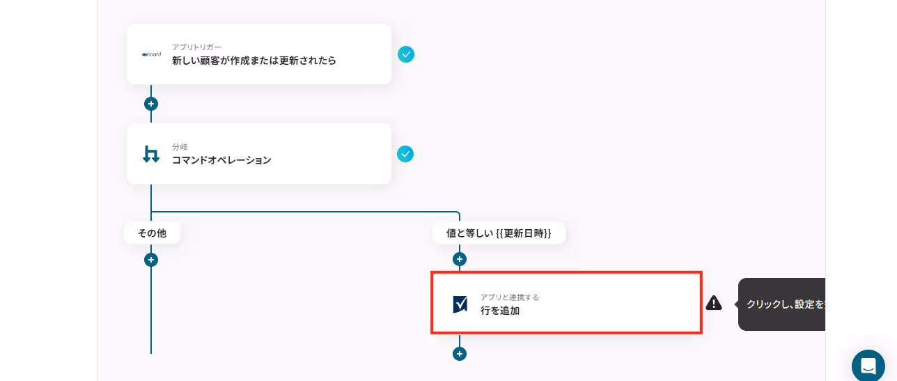 続いて、boardに作成した顧客情報の「作成日時」と「更新日時」が一致した場合にのみ分岐し、そのデータをSmartsheetに自動で連携できるように設定します。