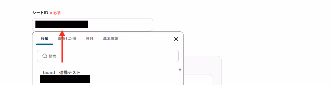 シートIDは、枠内をクリックし表示される候補から使用したいシート名を選択してください。