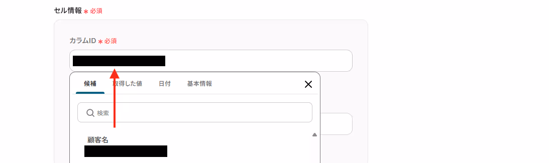 カラムIDは、候補からboardに登録した顧客情報を自動登録したいカラムを選択してください。
