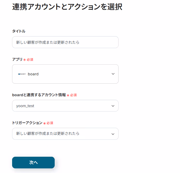 連携アカウントとアクションを選択する画面が表示されるので、今回連携するboardのアカウントを確認し「次へ」をクリックします。