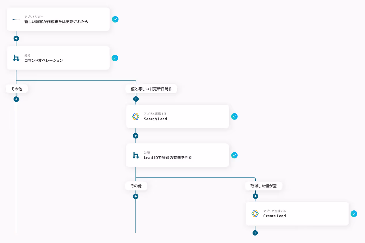 ただし、以下の構成のフローボットを作成することで、既存のリード情報と照合し、Closeへの重複登録を回避することもできます。