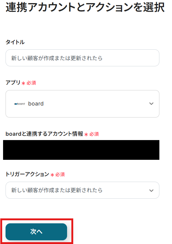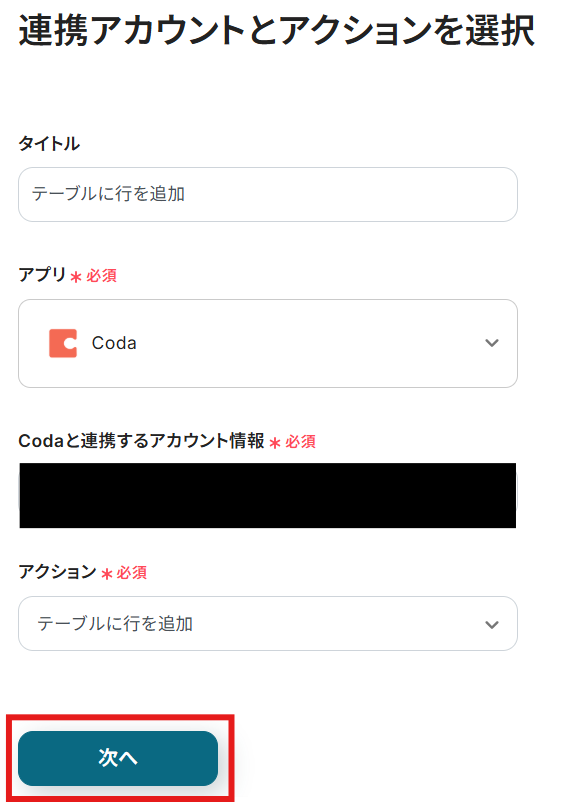 タイトルと連携するアカウント情報を確認し、アクションはテンプレート通りのまま「次へ」をクリックして進んでください。
