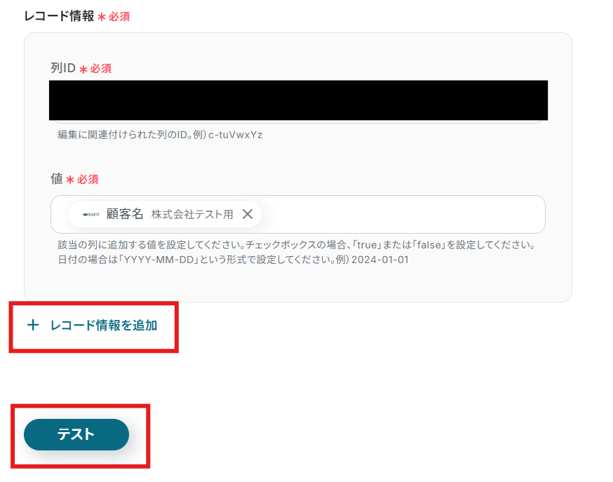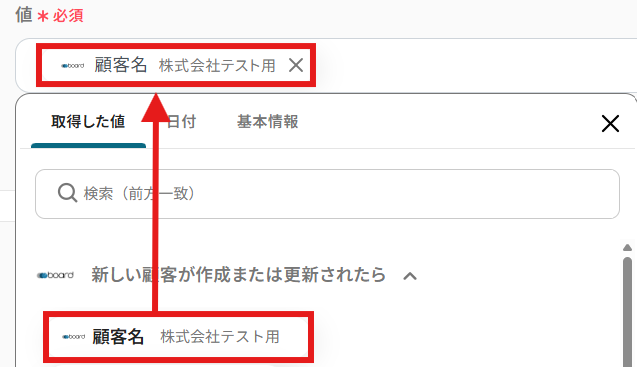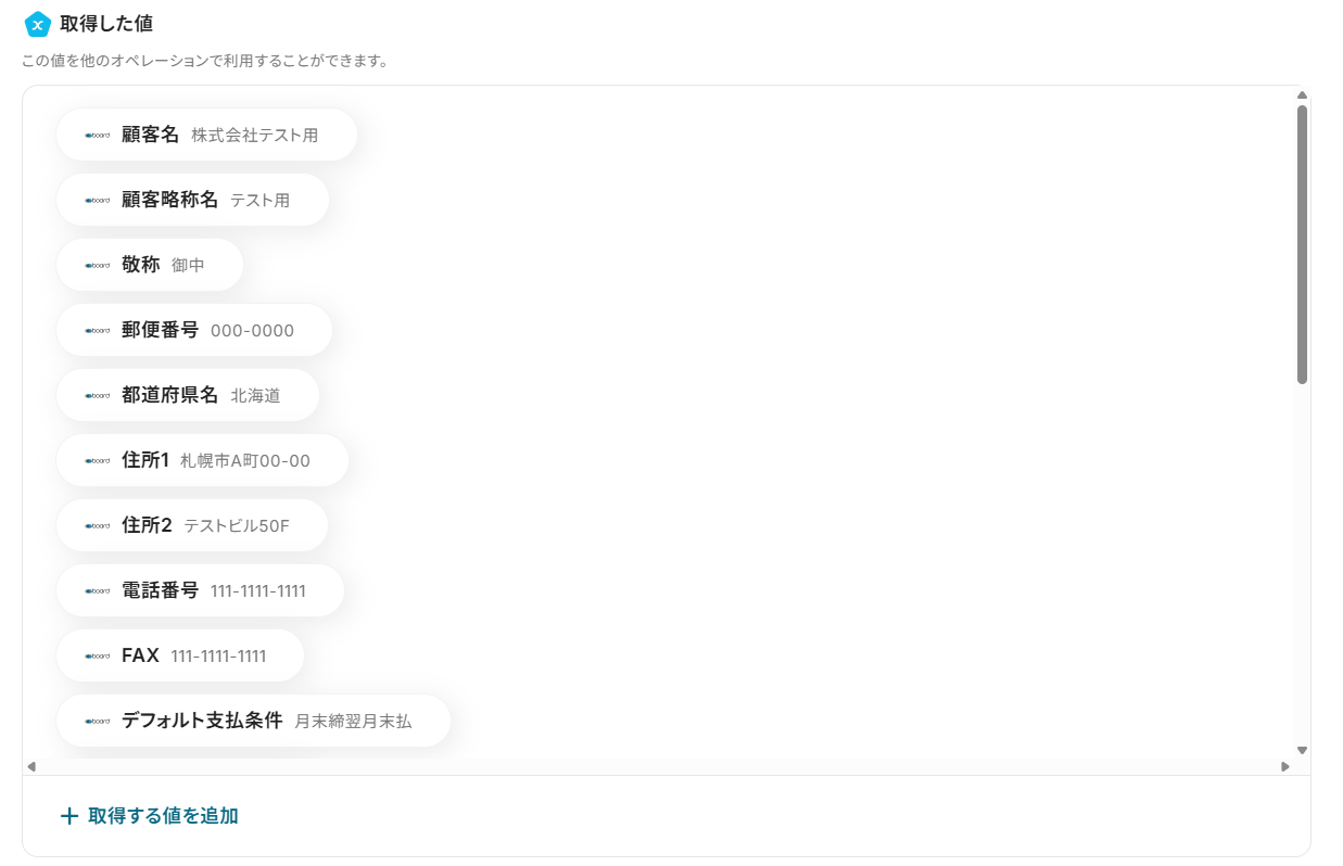 テストに成功すると「取得した値」(アウトプット)に反映されます。