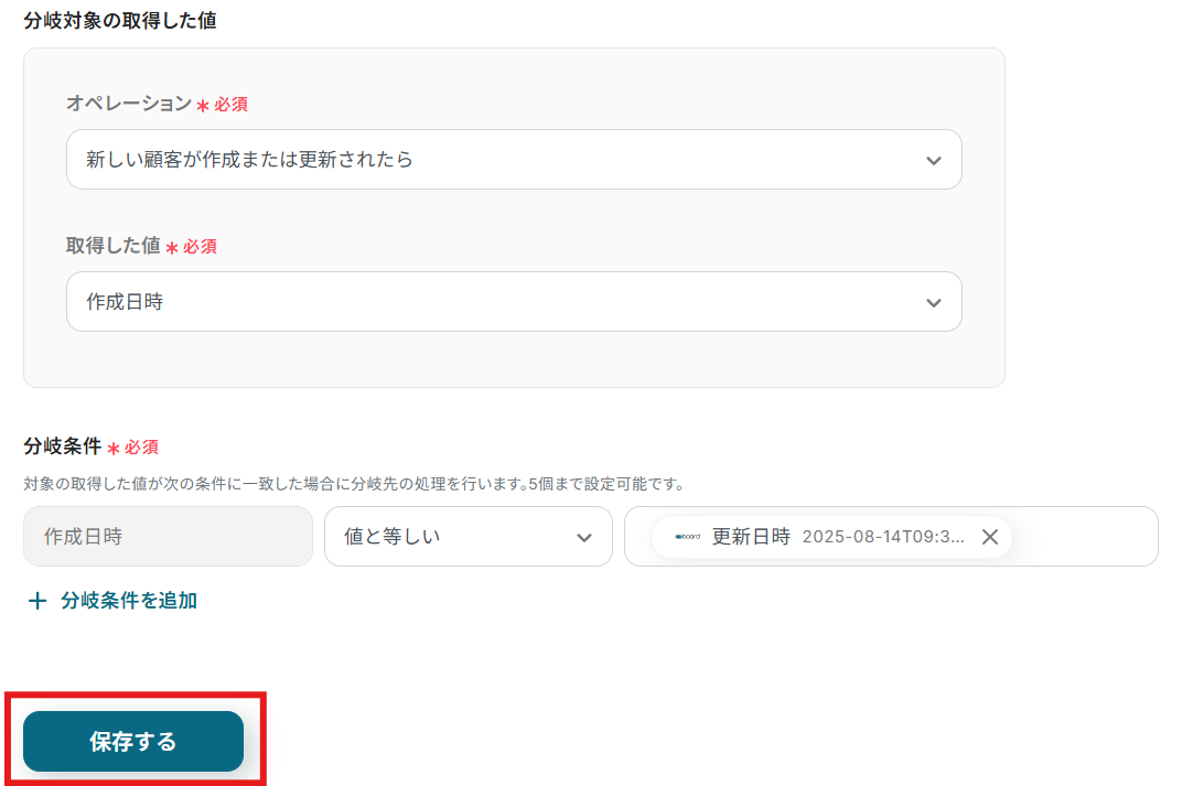 ここでは、「作成日時」と「更新日時」の値が等しいか否かで分岐するように設定されています。