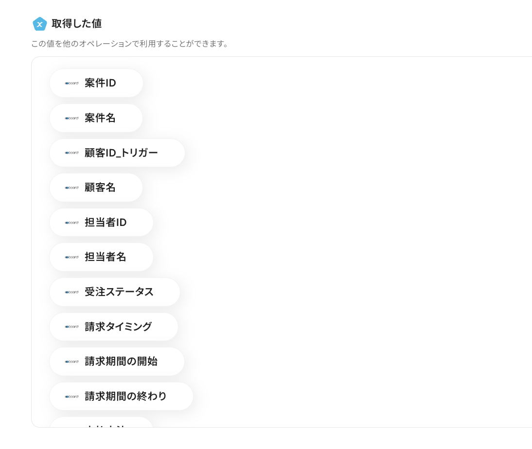 テストが成功すると、先ほど登録した案件の情報が「取得した値」にアウトプットとして抽出されるので、内容を確認しましょう。