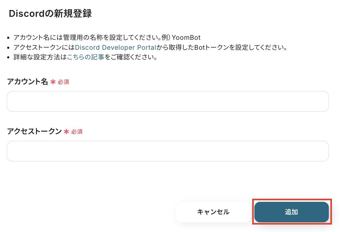 「アカウント名」は管理用の値を任意で入力し、「アクセストークン」はYoomと連携するDiscordアカウントから取得して入力しましょう。