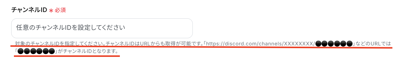 「チャンネルID」は、入力欄下に記載されている注釈の内容に従って、通知先となるDiscordのチャンネルURLから「チャンネルID」を確認して入力してください。