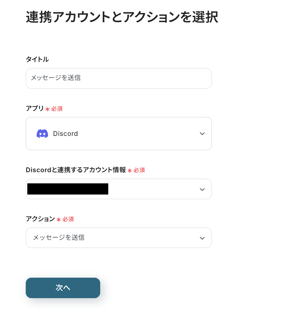 アクションは「メッセージを送信」のままにして、「次へ」を押してください。