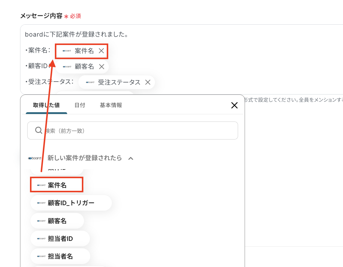 「boardに案件が登録されました。」など、毎回同じテキストを使用する文章は直接入力し、「案件名」や「受注ステータス」といったboardから取得する情報を引用する部分はアウトプットを使って設定しましょう。