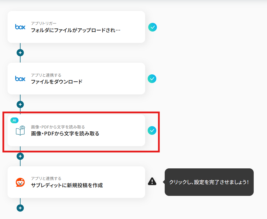 このワークフローは、Boxの特定フォルダにファイルがアップロードされると、OCR機能が自動でテキストを読み取り、その内容をRedditへ投稿します。