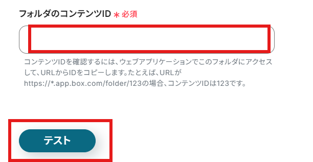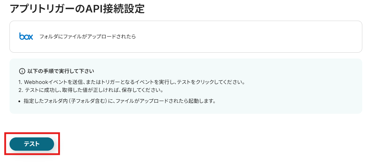 次に進んだら、「フォルダのコンテンツID」で設定したBoxのフォルダにテスト用のファイルをアップロードしましょう。